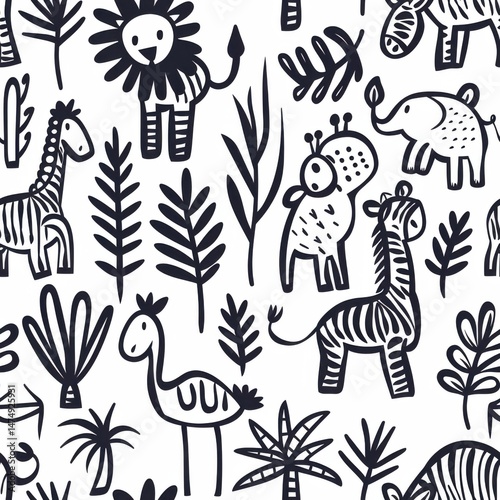 © Niphaphan, Fototapeta premium seamless minimal pattern of simple line art African animals, giraffe, lion, zebra, elephant, clean monochrome design