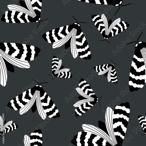 © tamatus_art, Naklejka premium Seamless monochrome black and white background pattern with abstract butterfly for printing on textiles or paper. Vector illustration in a hand-drawn style.