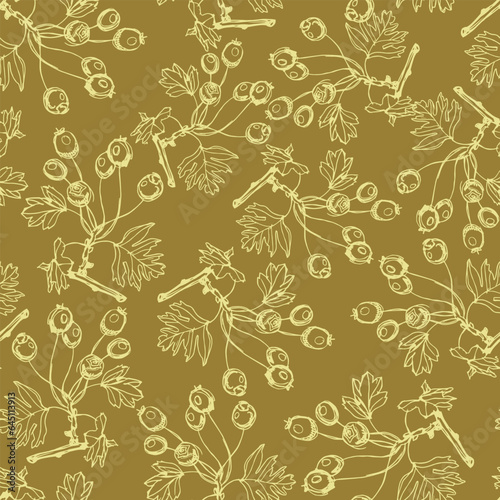 © Olena, Fototapeta premium Seamless monochrome floral pattern with silhouetted branches of hawthorn tree. Hand drawn linear sketches.