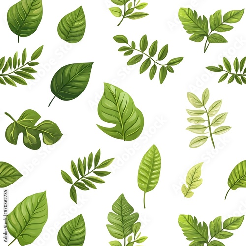 © LookChin AI, Fototapeta premium Seamless natural pattern with various fresh and vibrant green leaves on a white background
