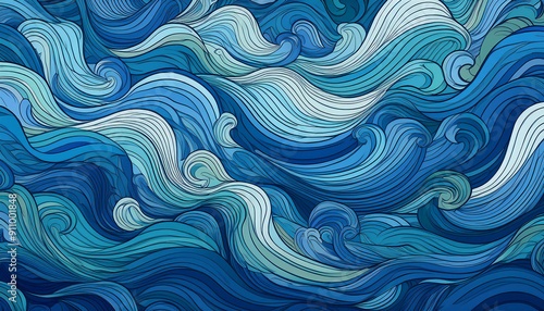 © Matthias, Obraz premium Seamless nautical pattern with stylized waves in different blue colors
