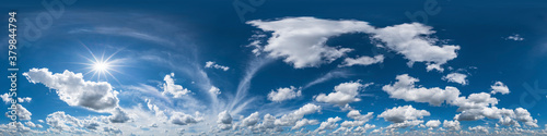 Obraz premium Seamless panorama with blue sky 360-degree view and beautiful clouds for use in 3D graphics as sky domes or for post-processing of drone shots