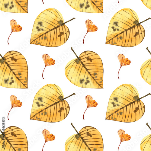 Obraz premium Seamless pattern and autumn leaves on a white background. Autumn leaves of yellow flowers, hand-painted in watercolor on a white background. Suitable for decoration, design, printing on fabric.