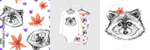 Obraz premium Seamless pattern and illustration set with hand drawn raccoon