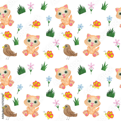 © Ирина Шишкова, Naklejka premium Seamless pattern Animals watercolor children illustration bird cat butterfly flowers design children's rooms wallpaper textiles digital paper