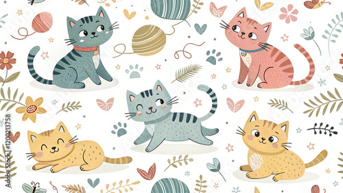 © anastasia_7em, Obraz premium seamless pattern background with cute cartoon cats and yarn balls