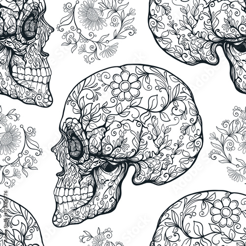 © Elen Lane, Fototapeta premium Seamless pattern, background with sugar skull and floral pattern. Outline drawing. Stock line vector illustration.