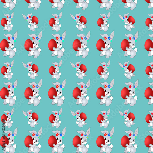 Obraz premium Seamless pattern bunnies with eggs isolated on blue background.