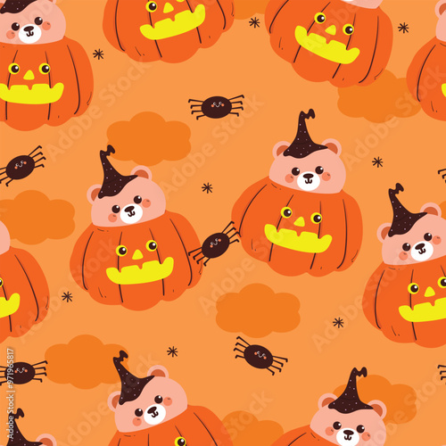 Naklejka premium seamless pattern cartoon bear with pumpkin and ghost for halloween. cute halloween wallpaper for fabric print, gift wrap paper