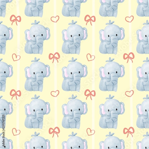 © JSstudio, Fototapeta premium Seamless pattern cute watercolor elephant decorated with bows and hearts on background.