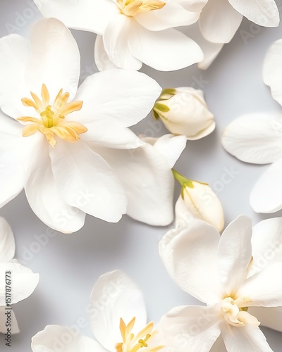 © Nisachon Seale, Obraz premium Seamless Pattern Delicate white flowers with yellow centers.