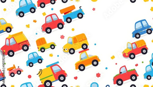 © Prisana, Naklejka premium Seamless pattern featuring cheerful cartoon vehicles in vibrant colors on a light background, simple, joy