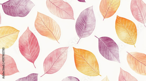 © Mahmud, Obraz premium "Seamless pattern featuring leaf stamps and watercolor textures, combined with delicate line art leaves to create a harmonious and elegant background."