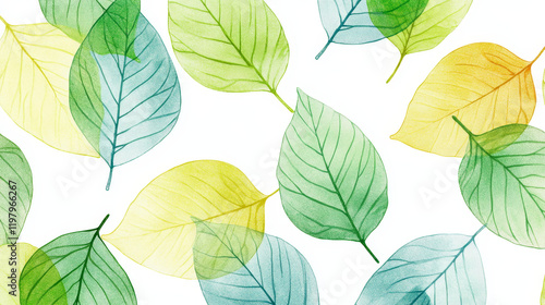 © Mahmud, Obraz premium "Seamless pattern featuring leaf stamps and watercolor textures, combined with delicate line art leaves to create a harmonious and elegant background."
