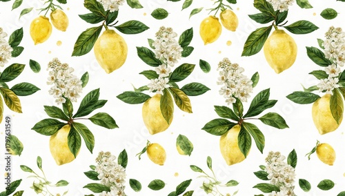 Naklejka premium Seamless pattern featuring lemon branches with flowers and green leaves, ideal for background design