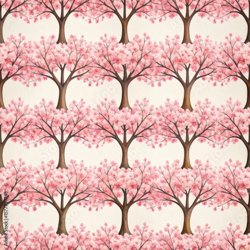 Obraz premium Seamless Pattern Featuring Pink Cherry Blossoms and Trees on Light Backdrop