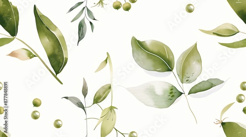 © CHOI POO, Naklejka premium Seamless pattern featuring watercolor green leaf and berry illustrations on a white background, ideal for nature-themed designs.