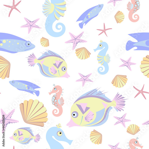 © EllSan, Naklejka premium Seamless pattern of abstract fish, starfish, shell and seahorse on white background. Cartoon style.