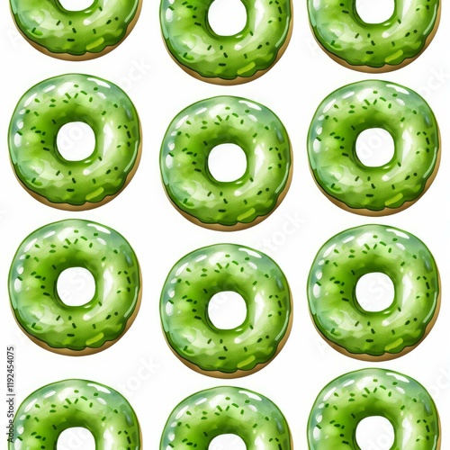 Fototapeta premium Seamless pattern of appetizing matcha donuts with green glaze and sprinkles, creating a delightful and tempting design