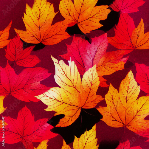 © Art N More, Fototapeta premium Seamless pattern of autumn fallen leaves. Red-yellow background of golden autumn as a concept of the change of seasons. Leaves of red maple, plane tree, birch.