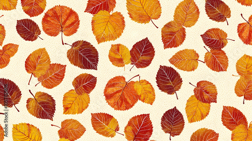 © bcendet, Fototapeta premium Seamless pattern of autumn leaves in orange, red and yellow hues on a beige background.