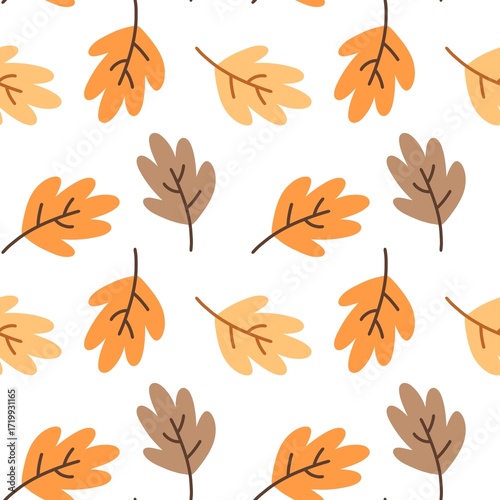 © Siti, Obraz premium Seamless pattern of autumn leaves in shades of orange, brown, and yellow on a white background. Perfect for fall-themed designs.