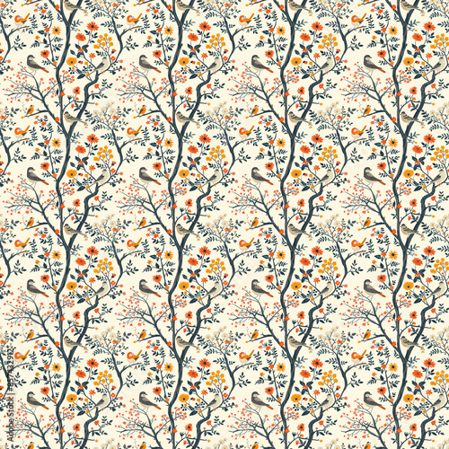 © Amro, Fototapeta premium Seamless Pattern of Birds and Flowers on Tree Branches