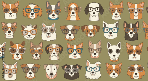 © art, Obraz premium Seamless pattern of cartoon dog faces wearing glasses on a green background