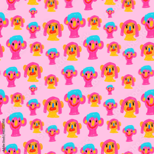© Yulia, Obraz premium seamless pattern of children's drawings-little men,houses,flowers.Children's doodles with felt-tip pens and pencils.Funny ornament for the nursery.Children's scribbles with freaky dudes.Hippie style