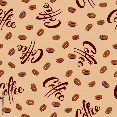 Obraz premium seamless pattern of coffee beans and lettering coffee on caramel background