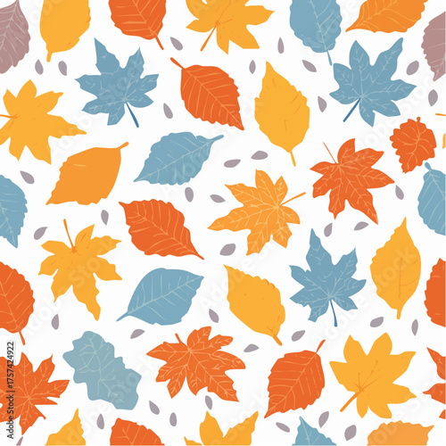 © Nurul, Fototapeta premium Seamless Pattern of Colorful Autumn Leaves Featuring Maple, Oak, and Chestnut Shapes on White Background