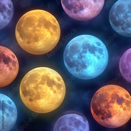 Obraz premium Seamless Pattern of Colorful Full Moons with Atmospheric Shadows