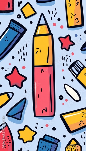 Fototapeta premium Seamless Pattern Of Colorful Hand Drawn Doodle Style Back To School Supplies With Pencil