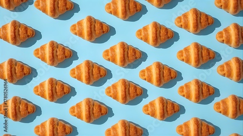 © PrimePixels, Fototapeta premium Seamless pattern of croissants on bright blue background, minimal food design, creative bakery concept with repetition, stylish pastry wallpaper for modern art, cafe branding, and decoration.