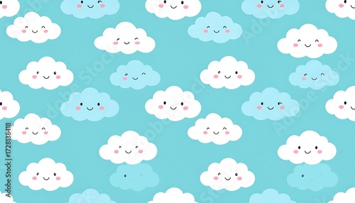 © Timon, Fototapeta premium Seamless pattern of cute cartoon clouds with happy faces on a light blue background