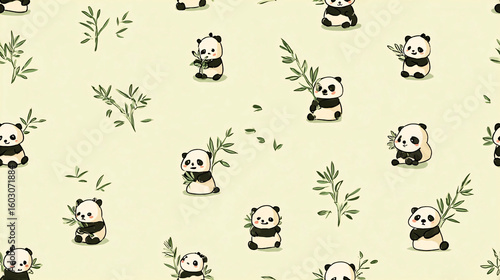 Fototapeta premium Seamless Pattern of Cute Cartoon Pandas with Bamboo Leaves on Light Yellow Background, Animal Illustration
