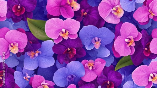 © ศุภมาส, Fototapeta premium Seamless pattern of exotic purple and fuchsia orchids with flowing petals, elegant floral design, perfect repeat tile, high quality