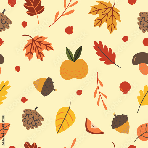 Obraz premium Seamless pattern of fall leaves, acorns, apples and berries. Autumn endless...