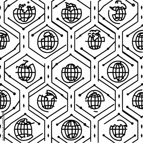 © Muhammad, Fototapeta premium Seamless pattern of globes in hexagons connected by lines and dots in a black and white drawing style