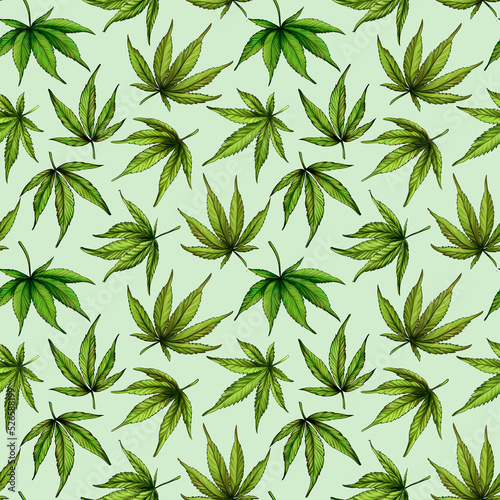 © Tatyana Olina, Fototapeta premium Seamless pattern of green cannabis leaves on a green background. Green hemp leaves. Hand drawn illustration.The seamless cannabis leaf pattern.marijuana pattern