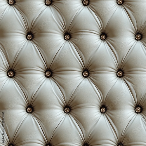 © Sergey, Fototapeta premium Seamless pattern of high-quality, elegant white leather upholstery with classic diamond tufting and shimmering golden buttons. Ideal for luxurious backgrounds.