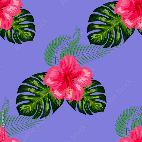 © MichiruKayo, Naklejka premium Seamless pattern of leaves monstera, flowers, tropical leaves of palm tree.