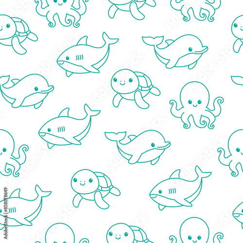 © Yaryna, Fototapeta premium Seamless pattern of line art sea animals on white background. Marine life animals. Template for baby shower, print, fabric, greeting cards and invitation.