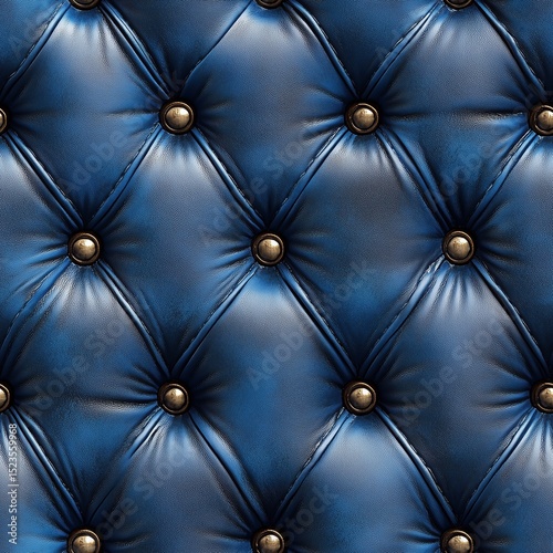 © Sergey, Fototapeta premium Seamless pattern of luxurious deep blue leather upholstery with classic diamond tufting and gleaming golden buttons. Ideal for sophisticated design backgrounds.