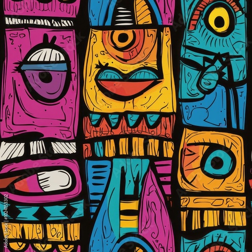 © fahmy, Obraz premium seamless pattern of mystical totems with vibrant tribal designs