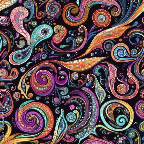 Obraz premium Seamless pattern of ornate paisley swirls in vibrant jewel tones on a black...