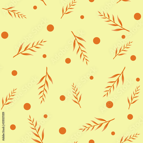 © Yuliya, Fototapeta premium Seamless pattern of red leaves and polka dots on a yellow background