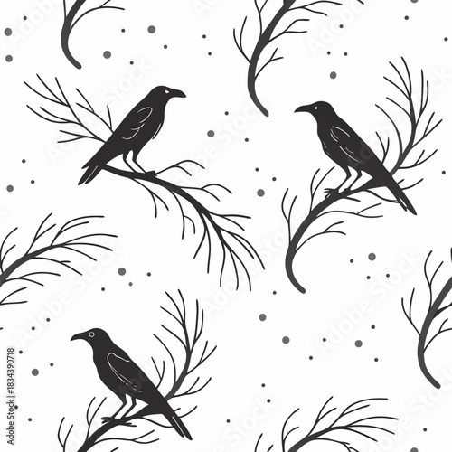 © Khan, Fototapeta premium Seamless pattern of silhouette crows on branches with dots raven