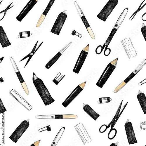 Obraz premium Seamless pattern of sketchedout school stationery, from scissors to staplers, with handdrawn charm, minimalist blackandwhite doodles doodle, school supplies, sketch, seamless