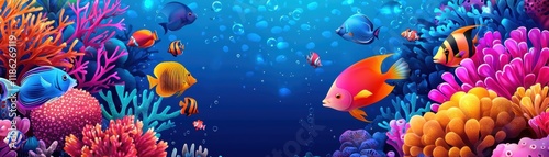Fototapeta premium Seamless pattern of tropical fish, coral, and sea anemones in vibrant colors for underwater-themed designs